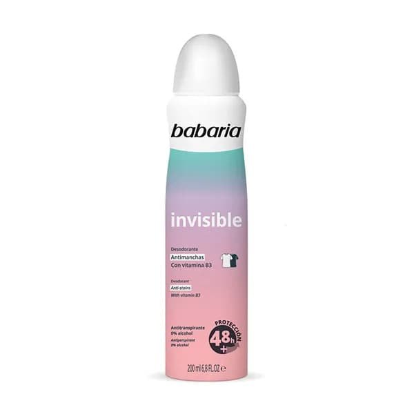 Caracteristicas de Babaria Spray Invisible: Protección Antitranspirante de 48 horas: Ofrece una protección duradera contra la sudoración excesiva, manteniéndote fresco y seco durante todo el día. Fórmula Antimanchas: Formulado específicamente para evitar las manchas blancas y amarillas en la ropa, garantizando que tu vestimenta se mantenga impecable. Vitamina B3: Enriquecido con vitamina B3, que ayuda a mantener la piel saludable y nutrida. 0% Alcohol: Libre de alcohol, lo que lo hace ideal incluso para las pieles más sensibles y delicadas. Testado Dermatológicamente: Ha sido sometido a pruebas dermatológicas para garantizar su compatibilidad con todo tipo de piel.