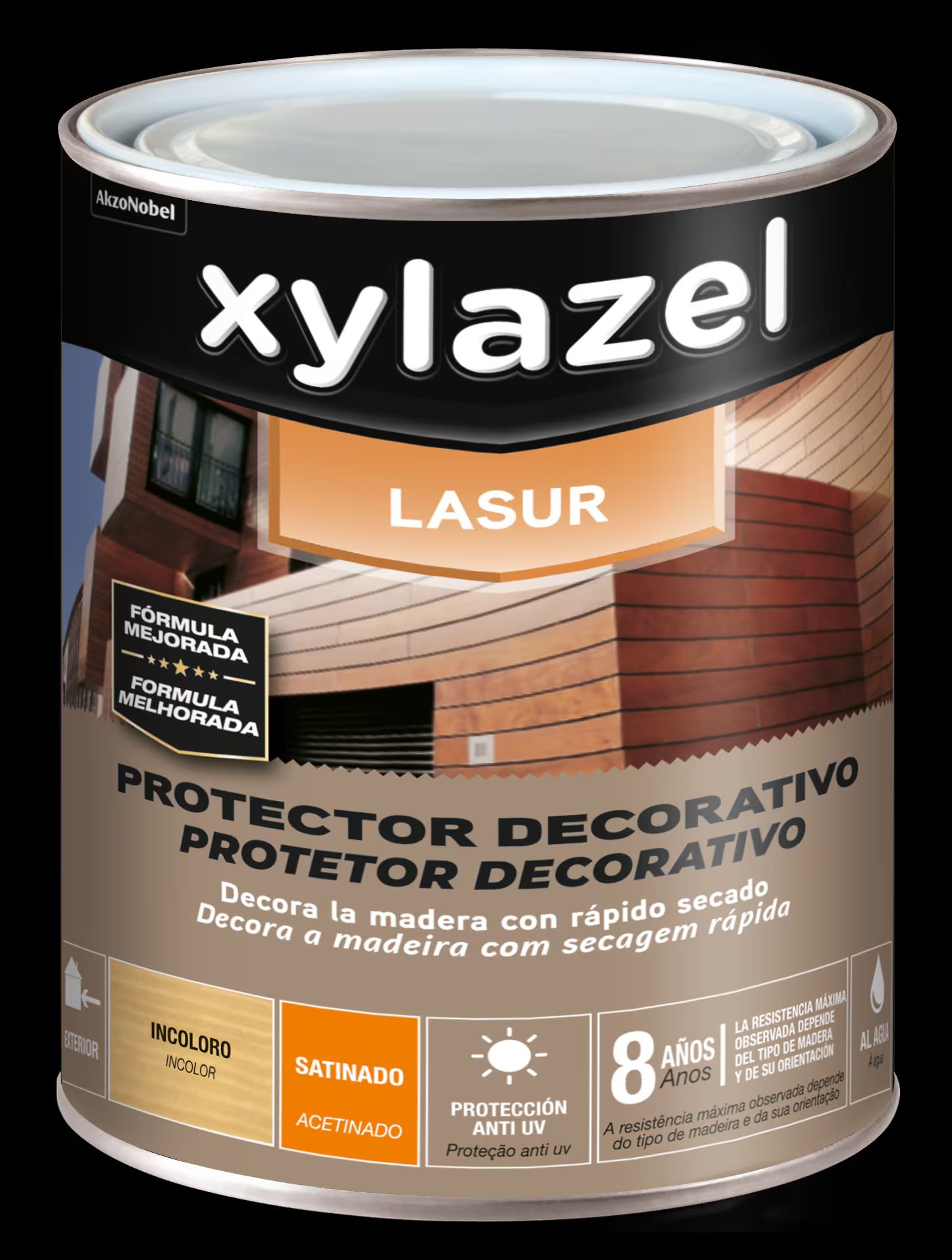 Xylazel Lasur Protector Decorativo Satinado al Agua es un lasur de dispersión acuosa de copolímero acrílico para proteger la madera del agua y a la intemperie.
